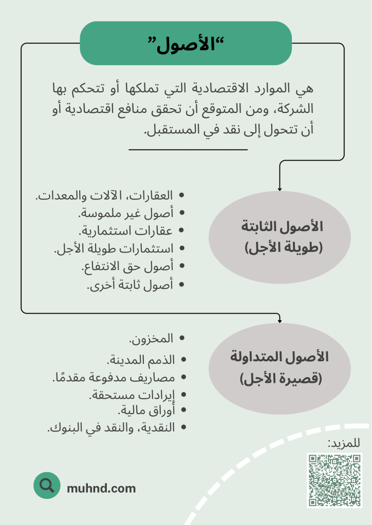 هي موارد اقتصادية تملكها أوتتحكم بها الشركة ومن المتوقع أن تحقق منافع اقتصادية أو أن تتحول إلى نقد في المستقبل.